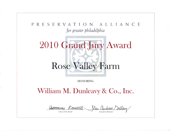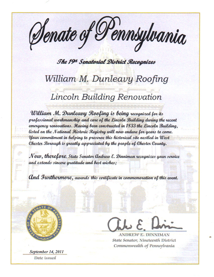 In 2011 our company was awarded for professional workmanship by the Pennsylvania Senate for our renovation of the historic Lincoln Building which was constructed in 1833. Wm. Dunleavy Roofing also received the Grand Jury Award in 2010 from the Philadelphia Preservation Alliance for our preservation work on the historic Rose Valley Farm.